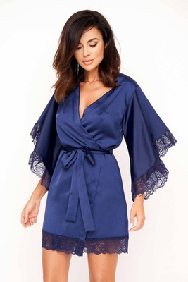 Szlafrok damski Luna - satynowy granatowy z asymetrycznymi rękawami