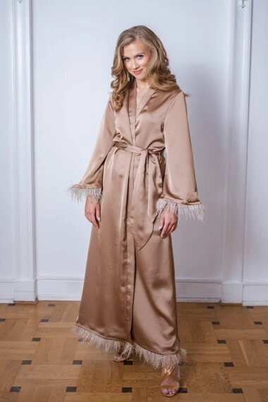 Szlafrok Penelope - długi, satynowy z piórami w kolorze złotym