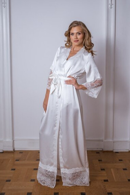 Szlafrok damski Aurora- satynowy ecru z koronką i wiązaniem w pasie