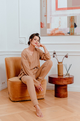 Piżama damska Estera - rozpinana koszulka z piórami i spodenki ecru z satyny