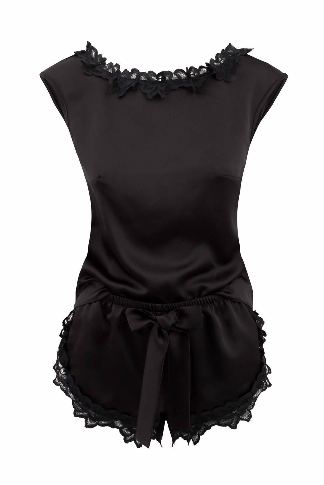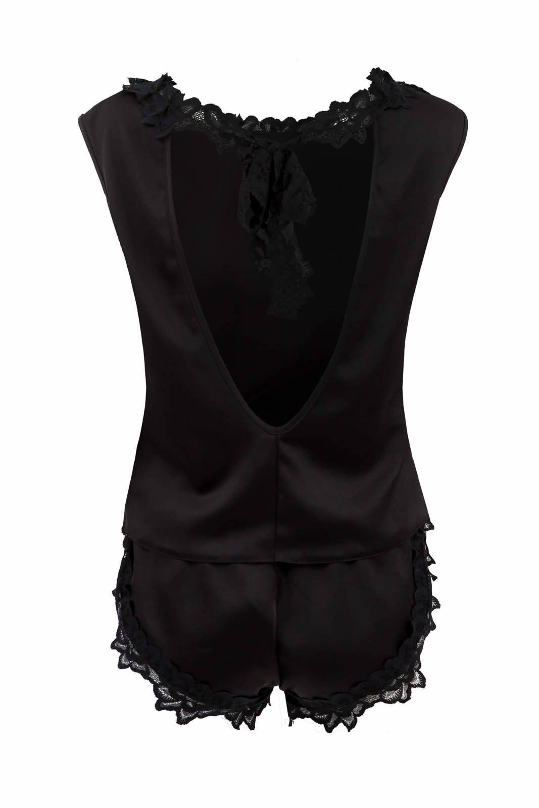Damska piżama z satyny, w kolorze głębokiej czerni. Model bez rękawów, z zabudowanym, obszytym koronką dekoltem. Wykrojone w literę V plecy, na które subtelnie opada elegancki, ażurowy splot. Jego kształt przypomina płatki kwiatów. Spodenki z głębokimi wycięciami po bokach oraz ozdobną kokardą z przodu. Wysoki stan szortów i gumka w pasie zapewniają komfort podczas snu. Piżama damska satynowa z koronką została zaprojektowana i wyprodukowana w Polsce.