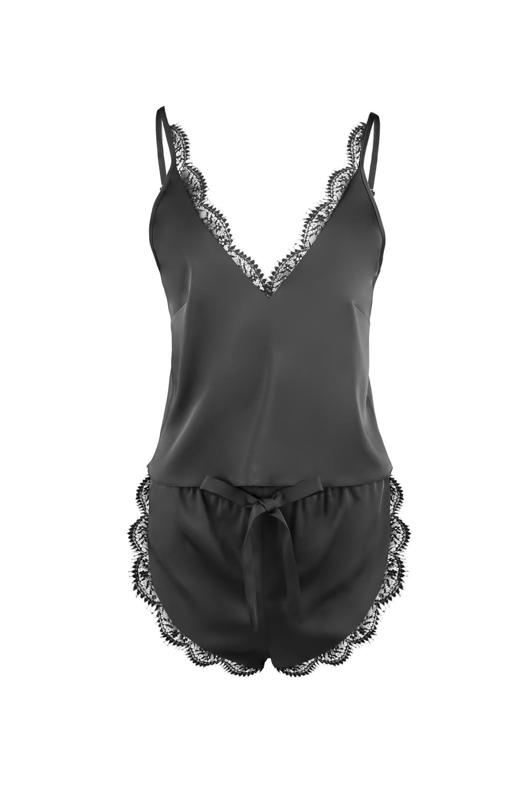 Damski komplet do spania w kolorze czarnym. Dekolt wykrojony w kształcie litery V i częściowo odkryte plecy. Lekko taliowany, krótki top na ramiączkach z regulacją. Spodenki z wysokim stanem, na elastycznej gumce, zapewniają wysoki komfort noszenia. Wąska wstążka, tworzy kokardę, dodając całości wyjątkowego uroku. Zdobienie bluzki i mankietów szortów miękką, włoską koronką. Satynowa piżama damska z koronką została zaprojektowana i wyprodukowana w Polsce.