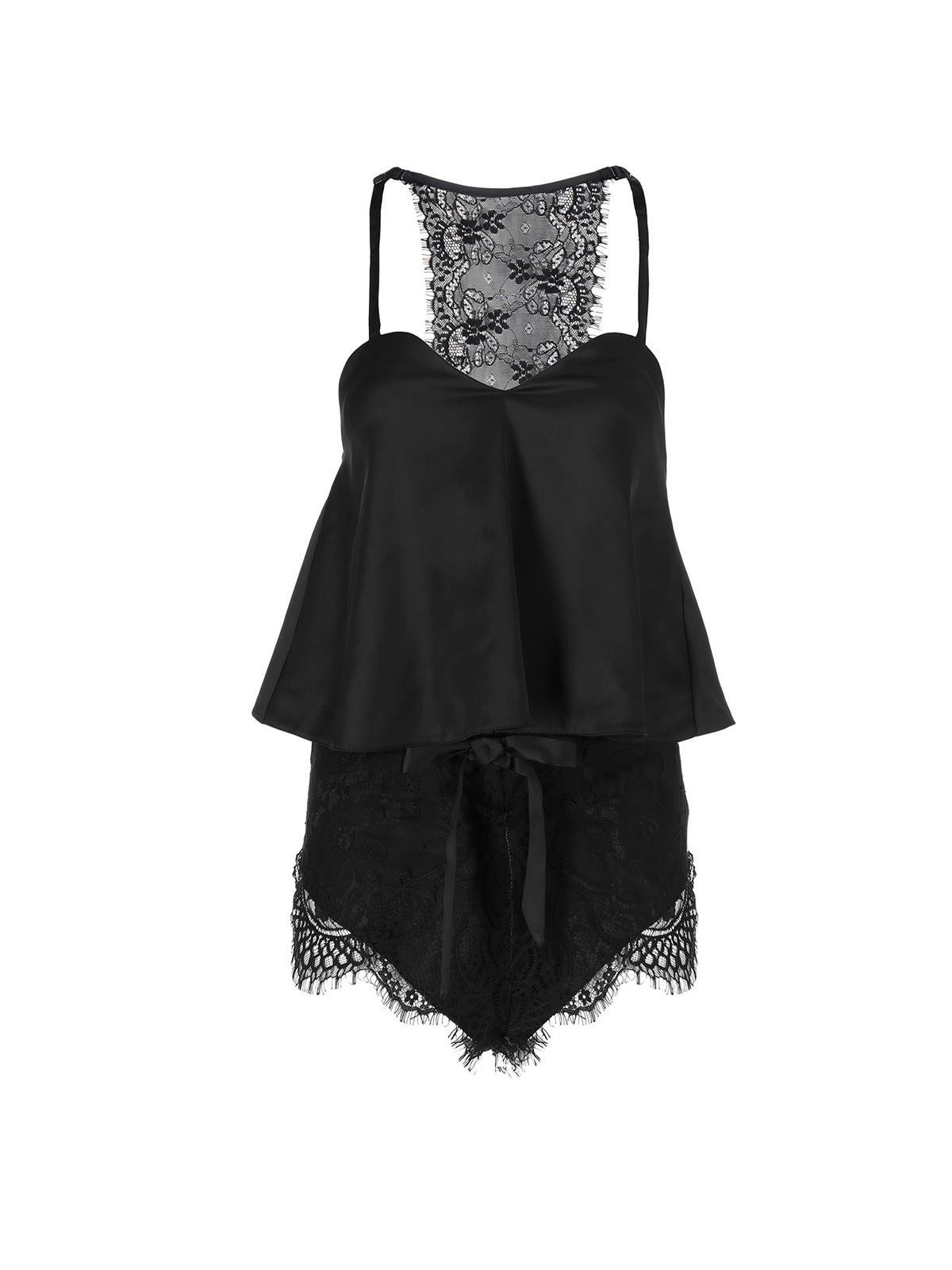 Damski komplet z satyny w ponadczasowej, czarnej barwie. Top o luźnym kroju, z delikatnego, matowego atłasu. Regulowane ramiączka, pozwalają na dopasowanie bluzki do sylwetki. Plecy zdobione niezwykle miękką, włoską koronką. Szorty z wysokim stanem, na elastycznej gumce. Dół w całości obszyty ażurowym splotem. Dekoracyjna kokarda. Satynowa piżama dla kobiet, została zaprojektowana i wyprodukowana w Polsce.
